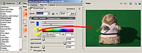 Now, click on the small eyedropper button in the Chroma Key dialog. The cursor will change to an eyedropper shape. Move the cursor to the preview panel and click on the color you want to matte out.