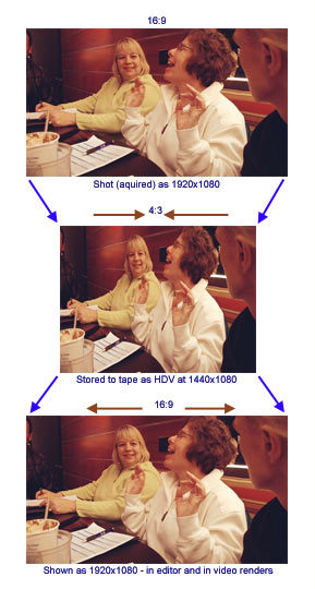 HDV is stored/recorded to the same miniDV tape used in standard def video cameras. Even though the shape of the video has a 16:9 ratio HDV manages to store the 33-percent wider format as a special case of the 4:3 ratio. Even when the camera records full 1920x1080 pixel images (16:9 ratio) it stores it on the tape as 1440x1080 (4:3 ratio). Then on editing and on play back this is expanded horizontally by one-third.