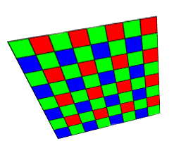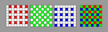 The components of the single-chip Bayer mosaic pattern shown at the right. Notice that there are twice as many green pixels. Kodak scientist Dr. Bryce E. Bayer invented this mosaic pattern for color image systems in the mid 1970s for both rgb and cmy sensors.(patent granted in 1976 - In his patent what we here use for green was only for luminance information and the colors of the other two was not specified) This illustrates a current typical RGB sensor.You expected that single-chip cameras would have red, green, blue pixels? Nope. Humans are more sensitive to green than any other color and so to get colors closer to what your eye sees the extra green sensor is used. But, unlike film, the sensors are not on top of each other (except the Foveon chip). What that means is that although each pixel position is a basic unit of the picture it is only recording one of the three colors at its location. To make up for that all single-chip cameras (keep excepting Foveon, of course) have to make up the other two colors at each pixel location by "interpolating." This means the camera's software looks at the colors around each pixel and uses their values to determine a value for the non-recorded colors.