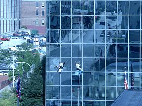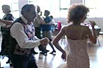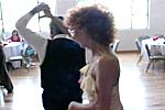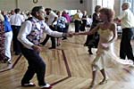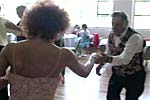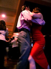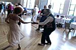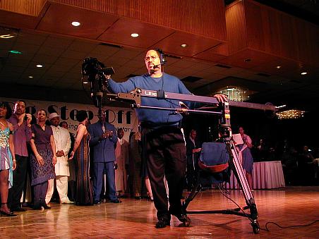Exposure Control - Automatic Versus Manual Automatic: The horrors of getting too much help. As you look at the series of captures notice the light and dark areas of the composition. Notice how changing the proportion of light to dark in the frame is noticed by the automatic exposure control. Although this shows you a compensation to try to overcome the loss of Leonard's facial detail when a very light area (the window) begins to occupy more space in the frame. This shows a clear need for manual exposure control in order to overcome the "helpfulness" of automatic exposure control. With manual exposure we would have had a much larger range of compositions without losing facial detail. 1 - start of clip. Black shirt helps balance light in window. Notice the relative percentages of light and dark in the frame. The eye sockets are a bit dark. 2 - camera moves very slightly upsetting the light/dark ratio. We loose Leonard's facial detail. 3 - A little more window. Leonards face is harder to see. Look at the change in percentages of light and dark in the frame. 4 - Now we are trying to correct for the autoexposure by changing the composition to include just the area most important to us - in this case Leonard's face. 5 - As we zoom into Leonard's face the camera begins to open up the diaphram. 6 - Closer yet. By this time the camera is getting the exposure for Leonard's face. But we really don't want the entire taping to be an Extreme Close-Up (ECU). 7 - Exposure is now okay for Leonard's face and we will attempt to change composition so we can back off. 8 - By putting Leonard's face in the corner (obsuring the lightest areas) we can have a little more surrounding area and still see our subject's face. His eye sockets also show more detail than #1. See this example clip of Leonard (16 sec) :: 56kb or 128kb connection (RealMedia) Manual: In this set of still captures from video the camera and the people are in flux but the camera's aperture, shutter speed and gain were all set manually and never changed all the way through. Look at how the exposures remain relatively the same regardless of whether the camera is pointed toward the windows (the source of light in the room) or away from the windows and into the room. Some exposures change because of the relative distance of the subjects to the light source (the windows) as they move within the ballroom. Unlike the still captures above none of the captures below go dark because of backlighting. Play the full clip below. See the full clip using manual exposure in a situation with a lot of movement for both camera and people. This is at Camelot Ballroom (151st street in Overland Park (Stanley)). There are large windows in the background providing most of the light in the room. Notice how the exposure, set for facial detail, remains the same even though the ratio of light and dark areas in the frame changes greatly.