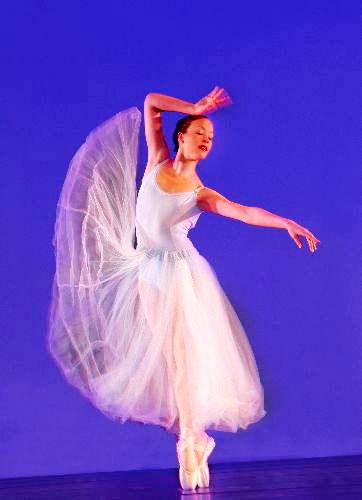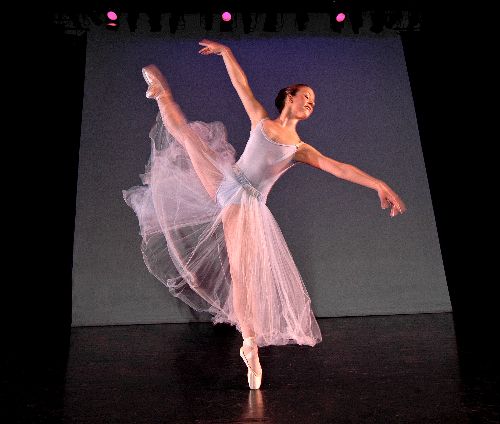 The setup is two electronic flash units onstage, one to the left and the other to the right. Then a larger electronic flash unit in the middle of the hall. All of them triggered by radio from the camera position.You can see a small amount of blur around her hands and feet (from the available light in the room due to a slow shutter speed) including a strongly defined image which comes from the electronic flash exposure.