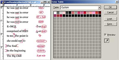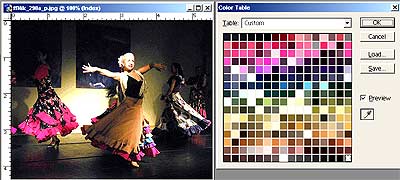 GIF color table for photograph showing many more colors. These are the colors derived from the original JPEG photograph. Notice that the color table is "Custom."