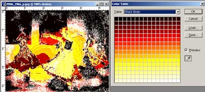 GIF color table for the above photograph in which the table derived from the original colors in the photographed is substituted by a "Black Body" set of colors. This shows that in a GIF all color definitions are contained within the color table. A single number at each pixel position refers back to a position in the color table. So changing which color table is being used changes all the colors. (unlike JPEGs in which each pixel holds its own color definition.)GIF images use indexed color. a color table is part of the image. All the colors in the image are defined in the color table. Then each pixel is simply an index number which refers to the predefined color in the color table.